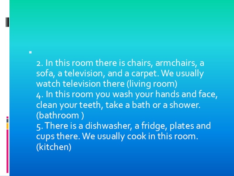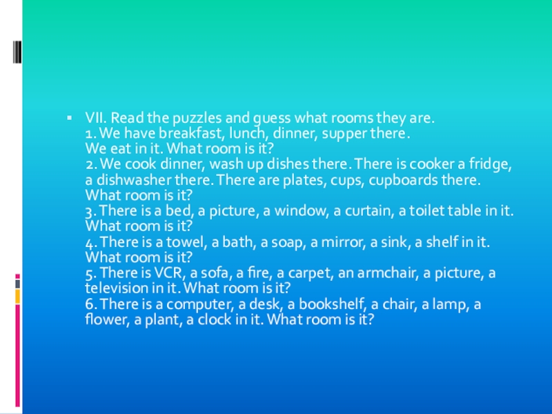Слайд 14VII. Read the puzzles and guess what rooms they are.