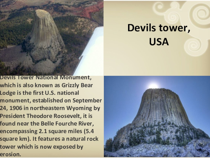 Grizzly Bear Lodge is the first U.S. national monument, established on September 24, 1906 in northeastern Wyoming by President Theodore Roosevelt, it is found near the Belle Fourche River, encompassing 2.1 square miles (5.4 square km). It features a natural rock tower which is now exposed by erosion.