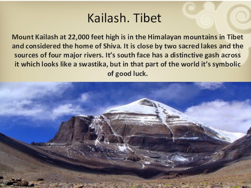 in Tibet and considered the home of Shiva. It is close by two sacred lakes and the sources of four major rivers. It’s south face has a distinctive gash across it which looks like a swastika, but in that part of the world it’s symbolic of good luck.