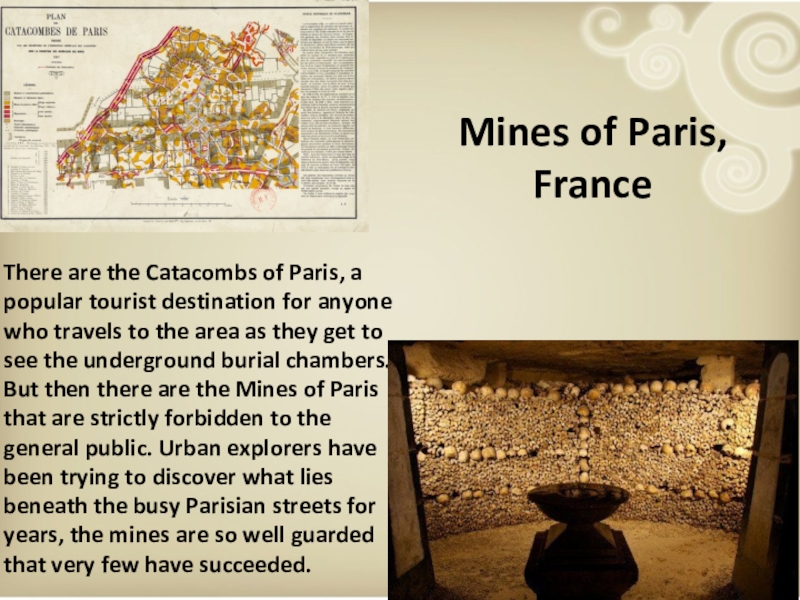 tourist destination for anyone who travels to the area as they get to see the underground burial chambers. But then there are the Mines of Paris that are strictly forbidden to the general public. Urban explorers have been trying to discover what lies beneath the busy Parisian streets for years, the mines are so well guarded that very few have succeeded.