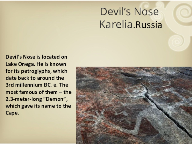 known for its petroglyphs, which date back to around the 3rd millennium BC. e. The most famous of them – the 2.3-meter-long “Demon”, which gave its name to the Cape.