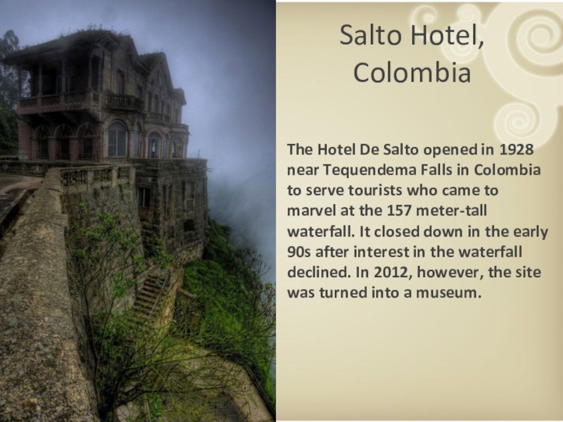 Falls in Colombia to serve tourists who came to marvel at the 157 meter-tall waterfall. It closed down in the early 90s after interest in the waterfall declined. In 2012, however, the site was turned into a museum.