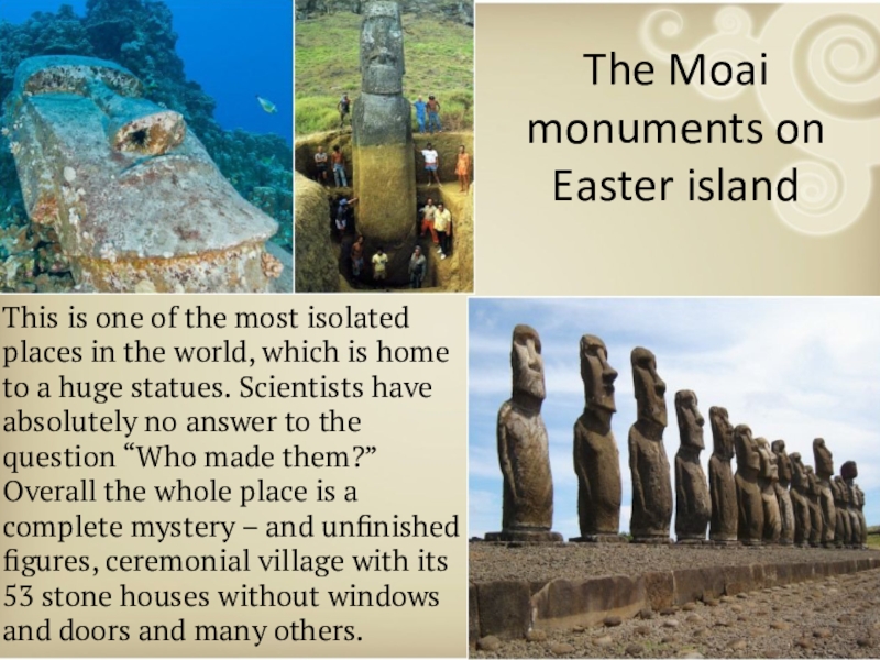 isolated places in the world, which is home to a huge statues. Scientists have absolutely no answer to the question “Who made them?” Overall the whole place is a complete mystery – and unfinished figures, ceremonial village with its 53 stone houses without windows and doors and many others.