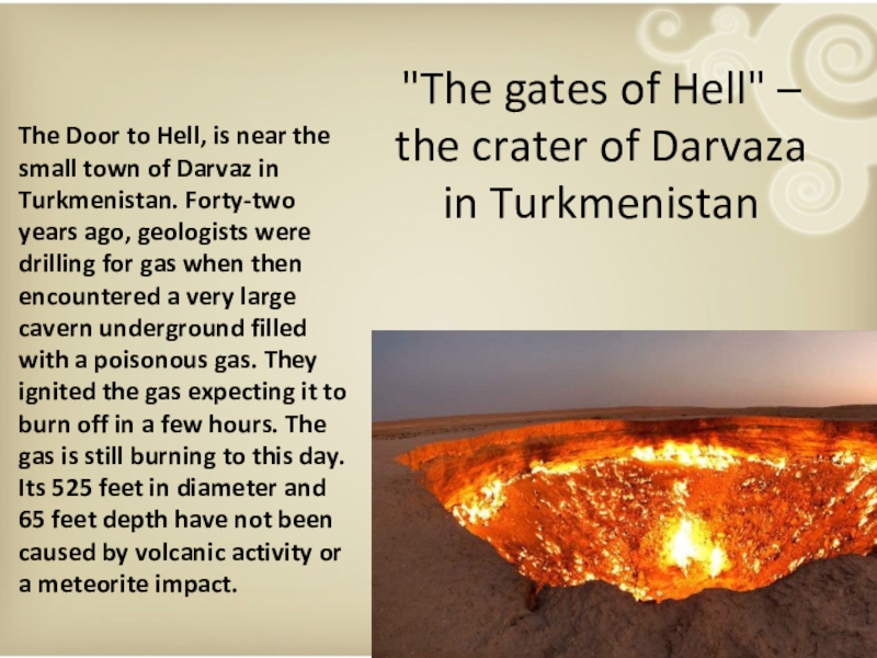 Слайд 14"The gates of Hell" – the crater of Darvaza in Turkmenistan