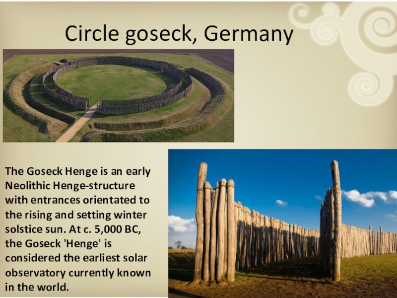 entrances orientated to the rising and setting winter solstice sun. At c. 5,000 BC, the Goseck 'Henge' is considered the earliest solar observatory currently known in the world.