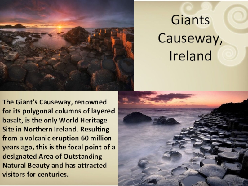 layered basalt, is the only World Heritage Site in Northern Ireland. Resulting from a volcanic eruption 60 million years ago, this is the focal point of a designated Area of Outstanding Natural Beauty and has attracted visitors for centuries.