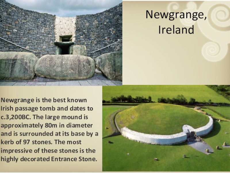 to c.3,200BC. The large mound is approximately 80m in diameter and is surrounded at its base by a kerb of 97 stones. The most impressive of these stones is the highly decorated Entrance Stone.