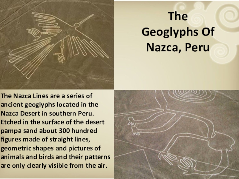 ancient geoglyphs located in the Nazca Desert in southern Peru. Etched in the surface of the desert pampa sand about 300 hundred figures made of straight lines, geometric shapes and pictures of animals and birds and their patterns are only clearly visible from the air.