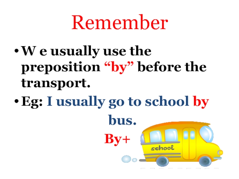 RememberW e usually use the preposition “by” before the transport.Eg: I usually go to school by