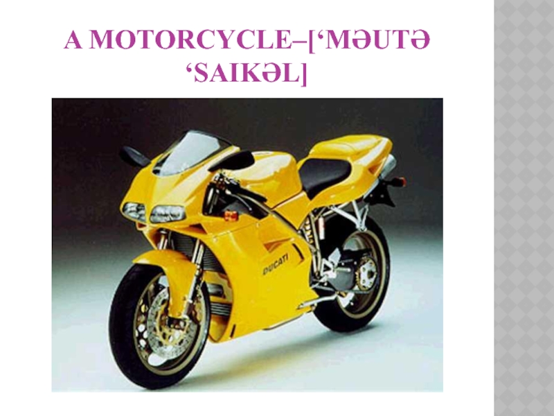 a motorcycle - [məυtə ‘saıkəl]- мотоцикл