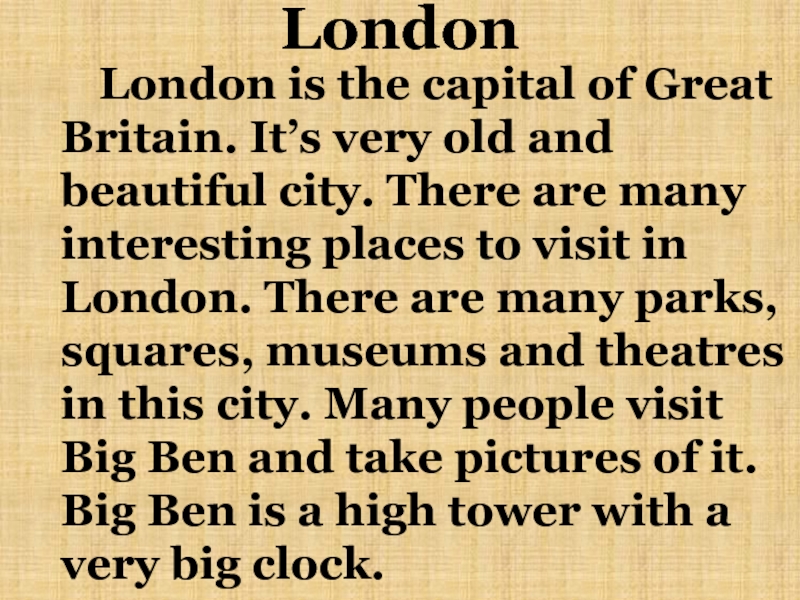 London     London is the capital of Great Britain. It’s very old and beautiful