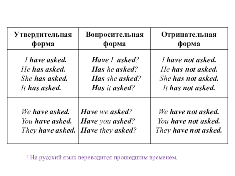 Present Perfect  		образуется при помощи вспомогательного глагола to have в настоящем времени и третьей формы