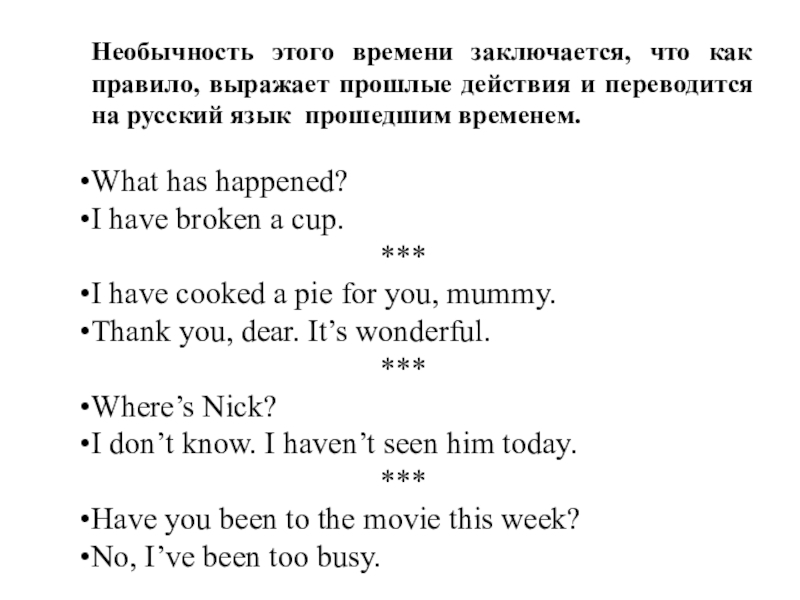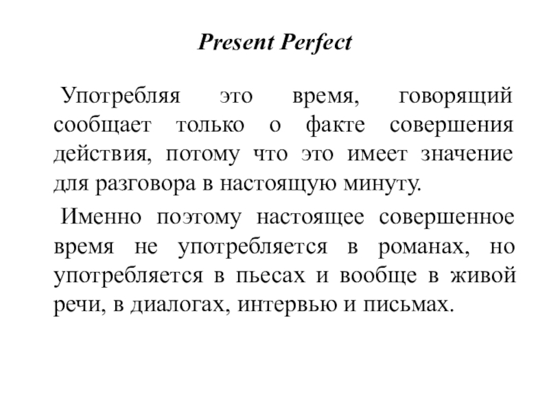 Present Perfect	Употребляя это время, говорящий сообщает только о факте совершения действия, потому что это имеет значение для