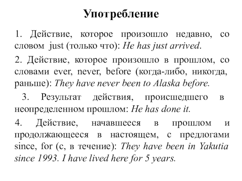 Употребление1. Действие, которое произошло недавно, со словом just (только что): He has just arrived.2. Действие, которое произошло