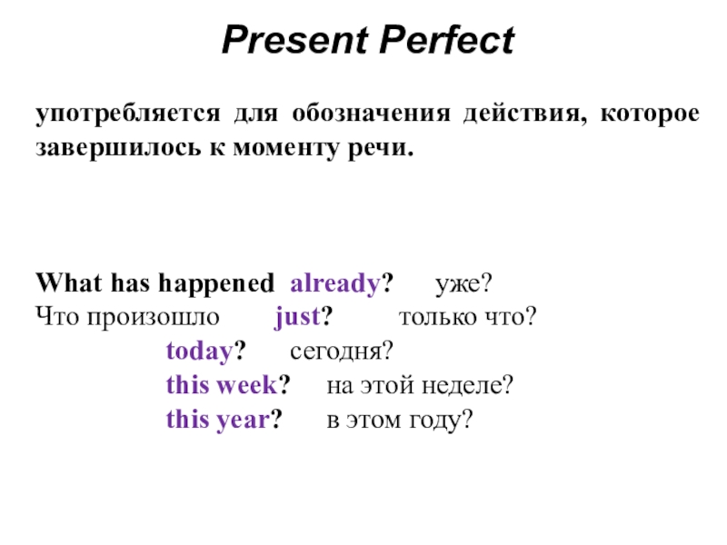 Present Perfect  	употребляется для обозначения действия, которое завершилось к моменту речи.What has happened already?		уже?Что произошло