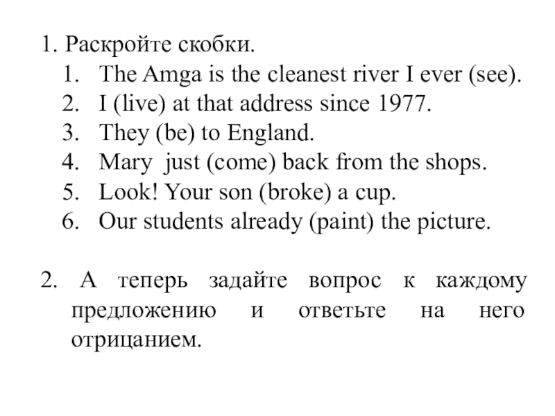 1. Раскройте скобки.The Amga is the cleanest river I ever (see).I (live) at that address since 1977.They