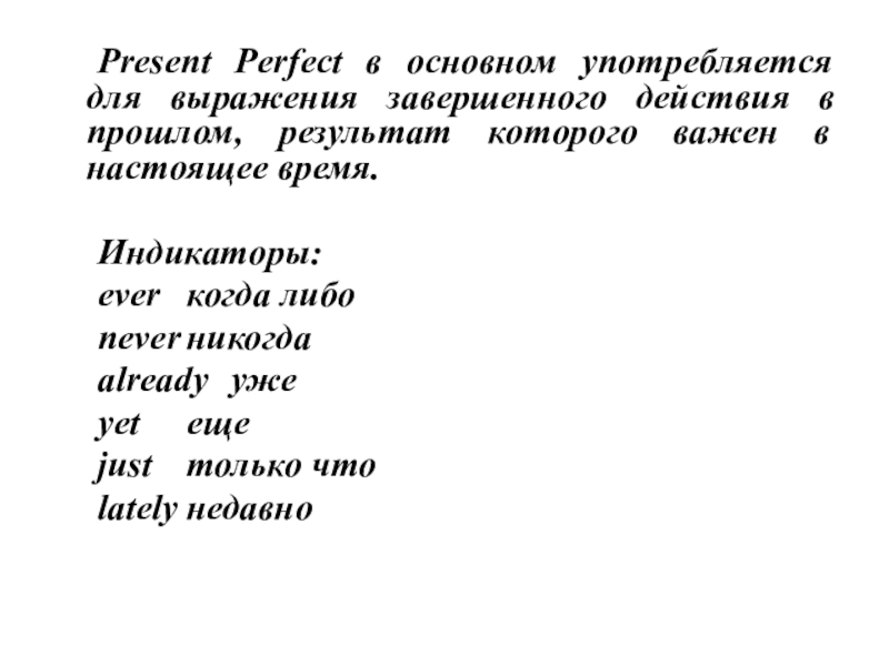 Present Perfect в основном употребляется для выражения завершенного действия в прошлом, результат которого важен в настоящее время.	Индикаторы: