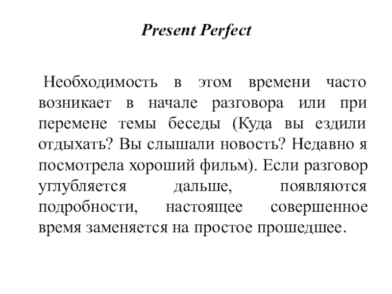 при перемене темы беседы (Куда вы ездили отдыхать? Вы слышали новость? Недавно я посмотрела хороший фильм). Если разговор углубляется дальше, появляются подробности, настоящее совершенное время заменяется на простое прошедшее.
