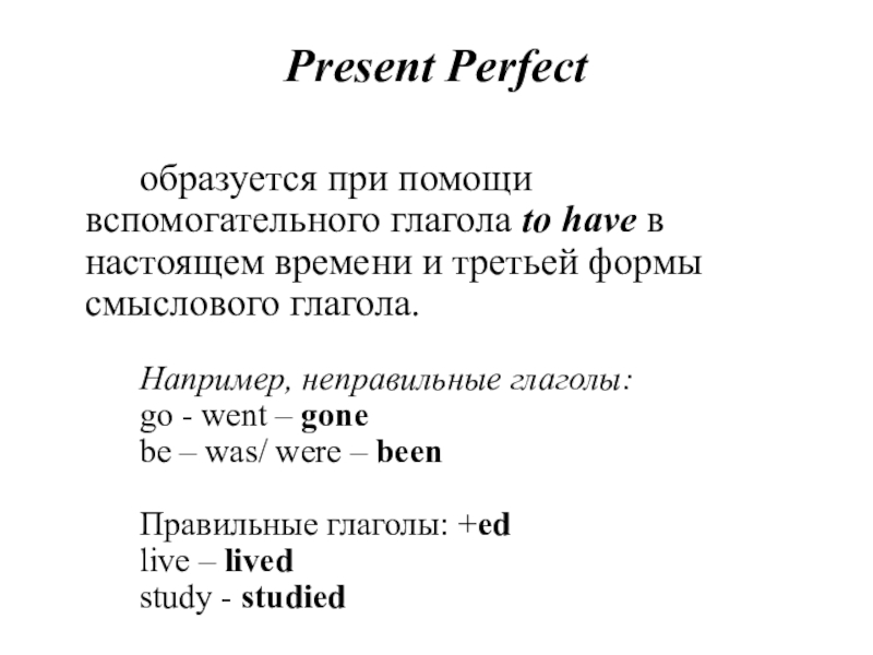 Present Perfect образуется при помощи вспомогательного глагола to have в настоящем времени и третьей формы смыслового глагола. Например, неправильные глаголы: go - went – gone be – was/ were – been Правильные глаголы: +ed live – lived study