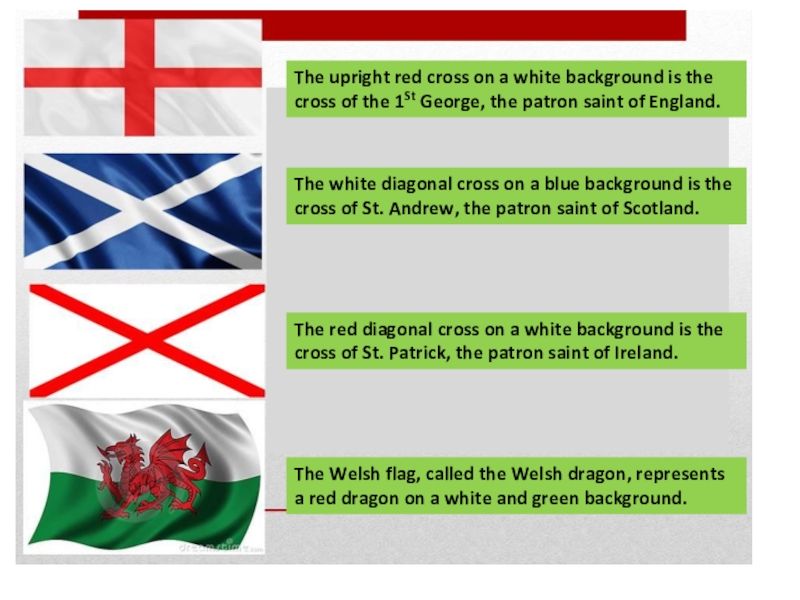 The Welsh flag, called the Welsh dragon, represents a red dragon on a white and green background.