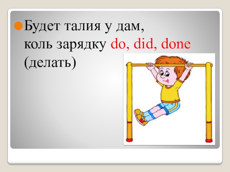 Слайд 13Будет талия у дам, коль зарядку do, did, done (делать)