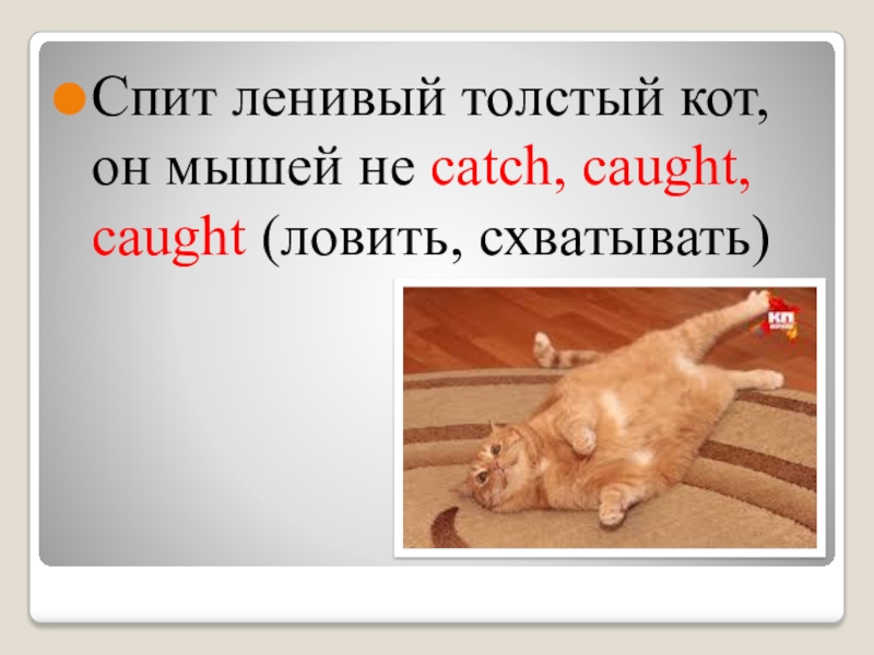 Слайд 7Спит ленивый толстый кот, он мышей не catch, caught, caught (ловить, схватывать)
