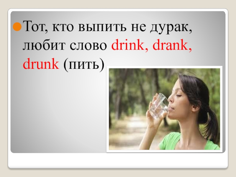 Слайд 14Тот, кто выпить не дурак, любит слово drink, drank, drunk (пить)