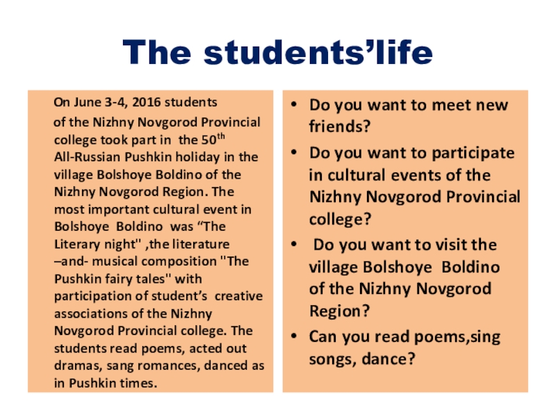 Do you want to participate in cultural events of the Nizhny Novgorod Provincial college?