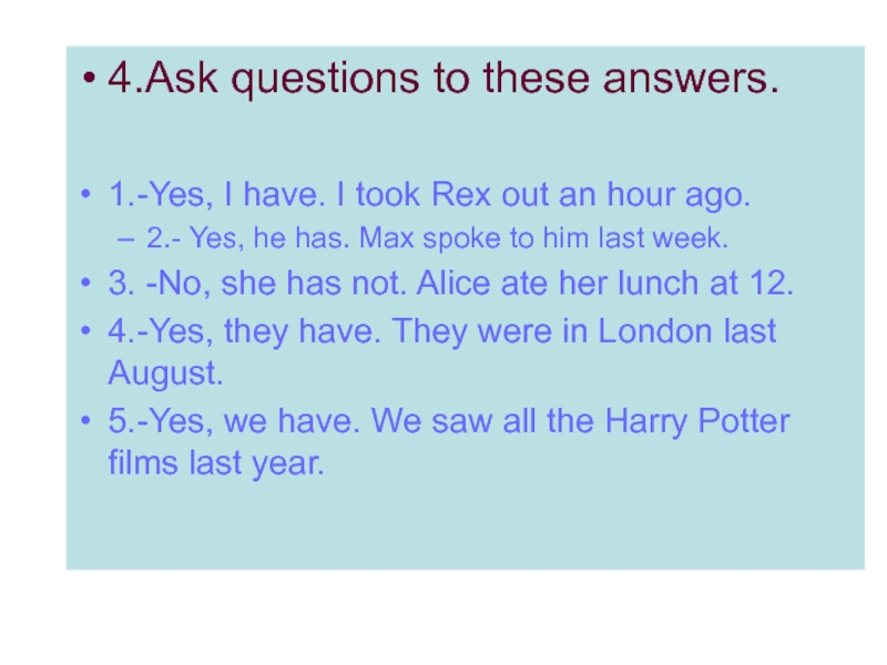 4.Ask questions to these answers.1.-Yes, I have. I took Rex out an hour ago.2.- Yes, he has.