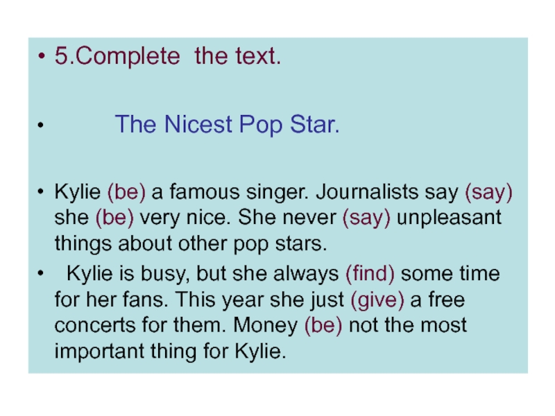 5.Complete the text.     The Nicest Pop Star.Kylie (be) a famous singer. Journalists say