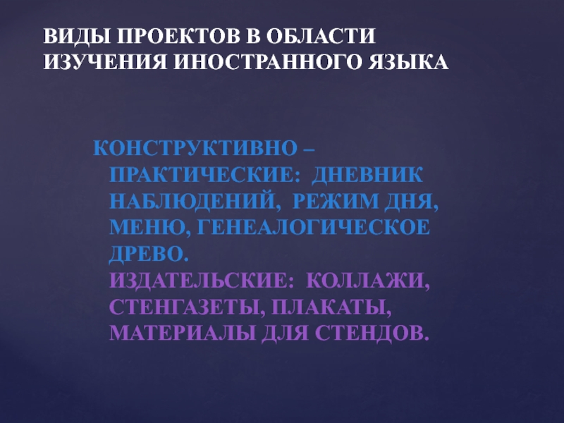Слайд 20ВИДЫ ПРОЕКТОВ В ОБЛАСТИ ИЗУЧЕНИЯ ИНОСТРАННОГО ЯЗЫКА