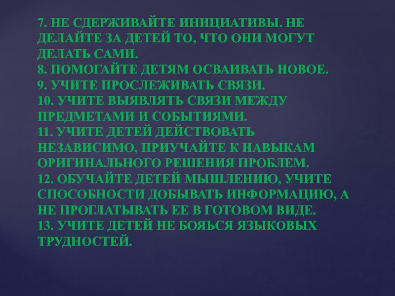 МОГУТ ДЕЛАТЬ САМИ. 8. ПОМОГАЙТЕ ДЕТЯМ ОСВАИВАТЬ НОВОЕ. 9. УЧИТЕ ПРОСЛЕЖИВАТЬ СВЯЗИ. 10. УЧИТЕ ВЫЯВЛЯТЬ СВЯЗИ МЕЖДУ ПРЕДМЕТАМИ И СОБЫТИЯМИ. 11. УЧИТЕ ДЕТЕЙ ДЕЙСТВОВАТЬ НЕЗАВИСИМО, ПРИУЧАЙТЕ К НАВЫКАМ ОРИГИНАЛЬНОГО РЕШЕНИЯ ПРОБЛЕМ. 12. ОБУЧАЙТЕ ДЕТЕЙ МЫШЛЕНИЮ, УЧИТЕ СПОСОБНОСТИ ДОБЫВАТЬ ИНФОРМАЦИЮ, А НЕ ПРОГЛАТЫВАТЬ ЕЕ В ГОТОВОМ ВИДЕ. 13. УЧИТЕ ДЕТЕЙ НЕ БОЯЬСЯ ЯЗЫКОВЫХ ТРУДНОСТЕЙ.