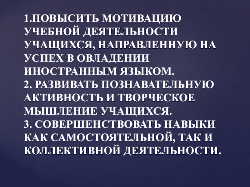 ЯЗЫКОМ. 2. РАЗВИВАТЬ ПОЗНАВАТЕЛЬНУЮ АКТИВНОСТЬ И ТВОРЧЕСКОЕ МЫШЛЕНИЕ УЧАЩИХСЯ. 3. СОВЕРШЕНСТВОВАТЬ НАВЫКИ КАК САМОСТОЯТЕЛЬНОЙ, ТАК И КОЛЛЕКТИВНОЙ ДЕЯТЕЛЬНОСТИ.