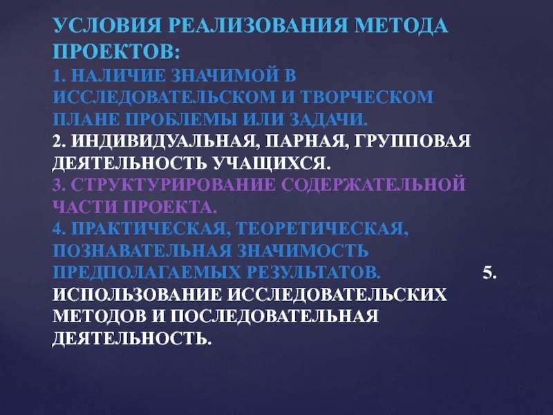 Слайд 14УСЛОВИЯ РЕАЛИЗОВАНИЯ МЕТОДА ПРОЕКТОВ: