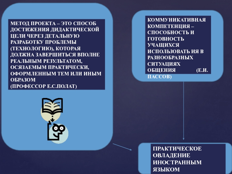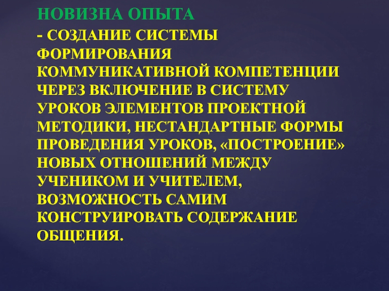 - СОЗДАНИЕ СИСТЕМЫ ФОРМИРОВАНИЯ КОММУНИКАТИВНОЙ КОМПЕТЕНЦИИ ЧЕРЕЗ ВКЛЮЧЕНИЕ В СИСТЕМУ УРОКОВ ЭЛЕМЕНТОВ ПРОЕКТНОЙ МЕТОДИКИ, НЕСТАНДАРТНЫЕ ФОРМЫ ПРОВЕДЕНИЯ УРОКОВ, «ПОСТРОЕНИЕ» НОВЫХ ОТНОШЕНИЙ МЕЖДУ УЧЕНИКОМ И УЧИТЕЛЕМ,ВОЗМОЖНОСТЬ САМИМ КОНСТРУИРОВАТЬ СОДЕРЖАНИЕ ОБЩЕНИЯ.