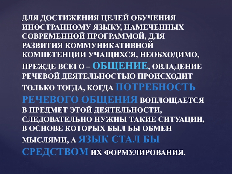 КОММУНИКАТИВНОЙ КОМПЕТЕНЦИИ УЧАЩИХСЯ, НЕОБХОДИМО, ПРЕЖДЕ ВСЕГО – ОБЩЕНИЕ, ОВЛАДЕНИЕ РЕЧЕВОЙ ДЕЯТЕЛЬНОСТЬЮ ПРОИСХОДИТ ТОЛЬКО ТОГДА, КОГДА ПОТРЕБНОСТЬ РЕЧЕВОГО ОБЩЕНИЯ ВОПЛОЩАЕТСЯ В ПРЕДМЕТ ЭТОЙ ДЕЯТЕЛЬНОСТИ, СЛЕДОВАТЕЛЬНО НУЖНЫ ТАКИЕ СИТУАЦИИ, В ОСНОВЕ КОТОРЫХ БЫЛ БЫ ОБМЕН МЫСЛЯМИ, А ЯЗЫК СТАЛ БЫ СРЕДСТВОМ ИХ ФОРМУЛИРОВАНИЯ.
