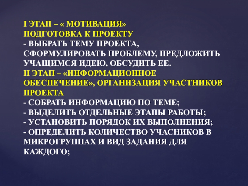 ПОДГОТОВКА К ПРОЕКТУ - ВЫБРАТЬ ТЕМУ ПРОЕКТА, СФОРМУЛИРОВАТЬ ПРОБЛЕМУ, ПРЕДЛОЖИТЬ УЧАЩИМСЯ ИДЕЮ, ОБСУДИТЬ ЕЕ. II ЭТАП – «ИНФОРМАЦИОННОЕ ОБЕСПЕЧЕНИЕ», ОРГАНИЗАЦИЯ УЧАСТНИКОВ ПРОЕКТА - СОБРАТЬ ИНФОРМАЦИЮ ПО ТЕМЕ; - ВЫДЕЛИТЬ ОТДЕЛЬНЫЕ ЭТАПЫ РАБОТЫ; - УСТАНОВИТЬ ПОРЯДОК ИХ ВЫПОЛНЕНИЯ; - ОПРЕДЕЛИТЬ КОЛИЧЕСТВО УЧАСНИКОВ В МИКРОГРУППАХ И ВИД ЗАДАНИЯ ДЛЯ КАЖДОГО;
