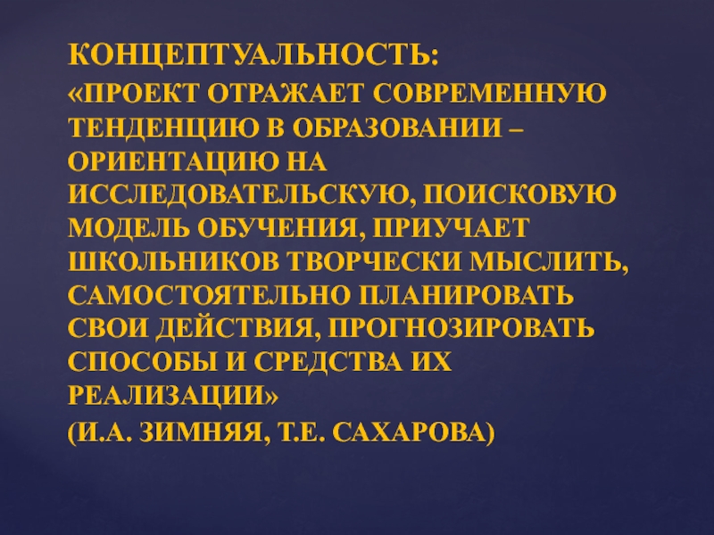 «ПРОЕКТ ОТРАЖАЕТ СОВРЕМЕННУЮ ТЕНДЕНЦИЮ В ОБРАЗОВАНИИ – ОРИЕНТАЦИЮ НА ИССЛЕДОВАТЕЛЬСКУЮ, ПОИСКОВУЮ МОДЕЛЬ ОБУЧЕНИЯ, ПРИУЧАЕТ ШКОЛЬНИКОВ ТВОРЧЕСКИ МЫСЛИТЬ, САМОСТОЯТЕЛЬНО ПЛАНИРОВАТЬ СВОИ ДЕЙСТВИЯ, ПРОГНОЗИРОВАТЬ СПОСОБЫ И СРЕДСТВА ИХ РЕАЛИЗАЦИИ» (И.А. ЗИМНЯЯ, Т.Е. САХАРОВА)