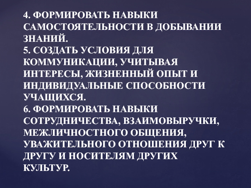 5. СОЗДАТЬ УСЛОВИЯ ДЛЯ КОММУНИКАЦИИ, УЧИТЫВАЯ ИНТЕРЕСЫ, ЖИЗНЕННЫЙ ОПЫТ И ИНДИВИДУАЛЬНЫЕ СПОСОБНОСТИ УЧАЩИХСЯ. 6. ФОРМИРОВАТЬ НАВЫКИ СОТРУДНИЧЕСТВА, ВЗАИМОВЫРУЧКИ, МЕЖЛИЧНОСТНОГО ОБЩЕНИЯ, УВАЖИТЕЛЬНОГО ОТНОШЕНИЯ ДРУГ К ДРУГУ И НОСИТЕЛЯМ ДРУГИХ КУЛЬТУР.