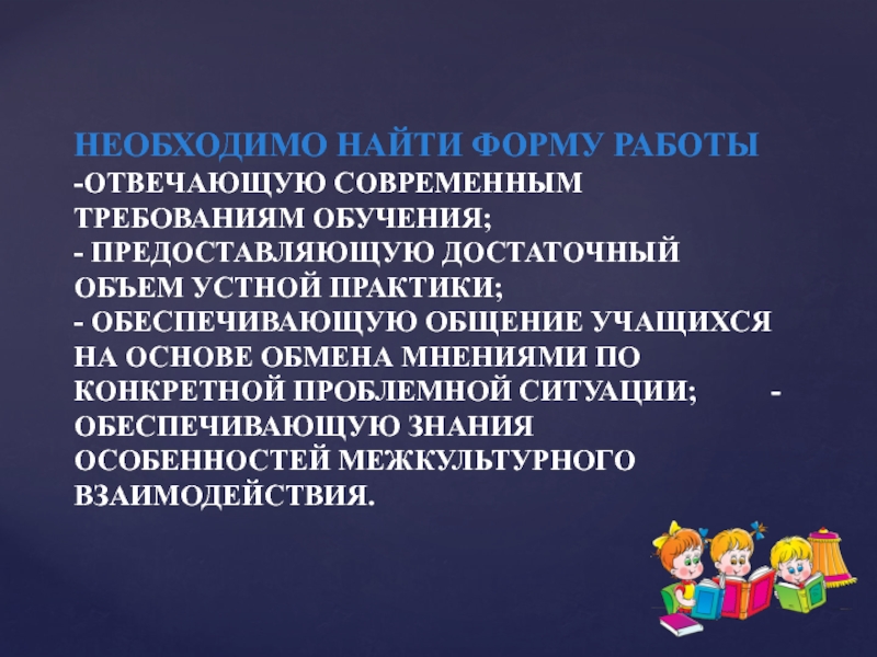 Слайд 6НЕОБХОДИМО НАЙТИ ФОРМУ РАБОТЫ -ОТВЕЧАЮЩУЮ СОВРЕМЕННЫМ
