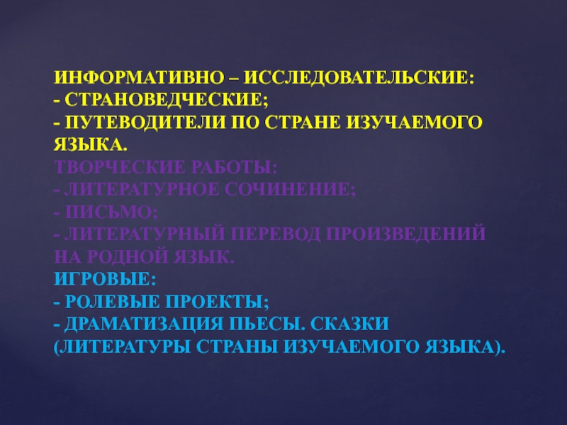 - ПУТЕВОДИТЕЛИ ПО СТРАНЕ ИЗУЧАЕМОГО ЯЗЫКА. ТВОРЧЕСКИЕ РАБОТЫ: - ЛИТЕРАТУРНОЕ СОЧИНЕНИЕ; - ПИСЬМО; - ЛИТЕРАТУРНЫЙ ПЕРЕВОД ПРОИЗВЕДЕНИЙ НА РОДНОЙ ЯЗЫК. ИГРОВЫЕ: - РОЛЕВЫЕ ПРОЕКТЫ; - ДРАМАТИЗАЦИЯ ПЬЕСЫ. СКАЗКИ (ЛИТЕРАТУРЫ СТРАНЫ ИЗУЧАЕМОГО ЯЗЫКА).