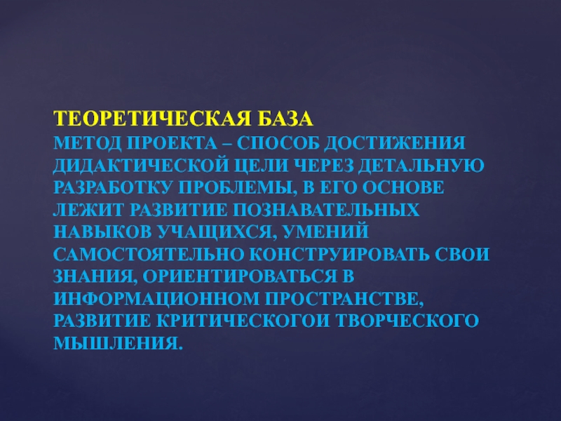 МЕТОД ПРОЕКТА – СПОСОБ ДОСТИЖЕНИЯ ДИДАКТИЧЕСКОЙ ЦЕЛИ ЧЕРЕЗ ДЕТАЛЬНУЮ РАЗРАБОТКУ ПРОБЛЕМЫ, В ЕГО ОСНОВЕ ЛЕЖИТ РАЗВИТИЕ ПОЗНАВАТЕЛЬНЫХ НАВЫКОВ УЧАЩИХСЯ, УМЕНИЙ САМОСТОЯТЕЛЬНО КОНСТРУИРОВАТЬ СВОИ ЗНАНИЯ, ОРИЕНТИРОВАТЬСЯ В ИНФОРМАЦИОННОМ ПРОСТРАНСТВЕ, РАЗВИТИЕ КРИТИЧЕСКОГОИ ТВОРЧЕСКОГО МЫШЛЕНИЯ.