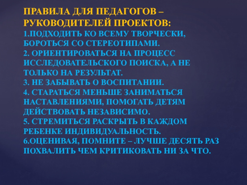 Слайд 26ПРАВИЛА ДЛЯ ПЕДАГОГОВ – РУКОВОДИТЕЛЕЙ ПРОЕКТОВ: