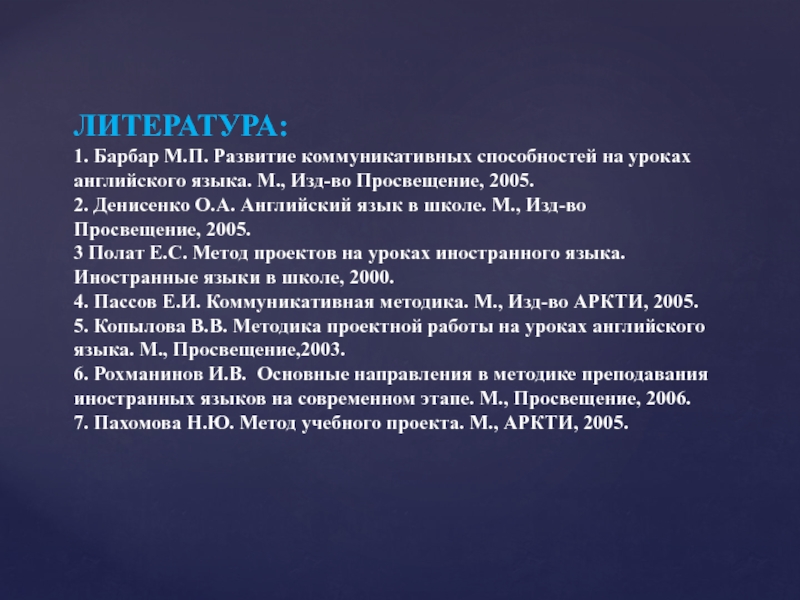 1. Барбар М.П. Развитие коммуникативных способностей на уроках английского языка. М., Изд-во Просвещение, 2005. 2. Денисенко О.А. Английский язык в школе. М., Изд-во Просвещение, 2005. 3 Полат Е.С. Метод проектов на уроках иностранного языка. Иностранные языки в школе, 2000. 4. Пассов Е.И. Коммуникативная методика. М., Изд-во АРКТИ, 2005. 5. Копылова В.В. Методика проектной работы на уроках английского языка. М., Просвещение,2003. 6. Рохманинов И.В. Основные направления в методике преподавания иностранных языков на современном этапе. М., Просвещение, 2006. 7. Пахомова Н.Ю. Метод учебного проекта. М., АРКТИ, 2005.