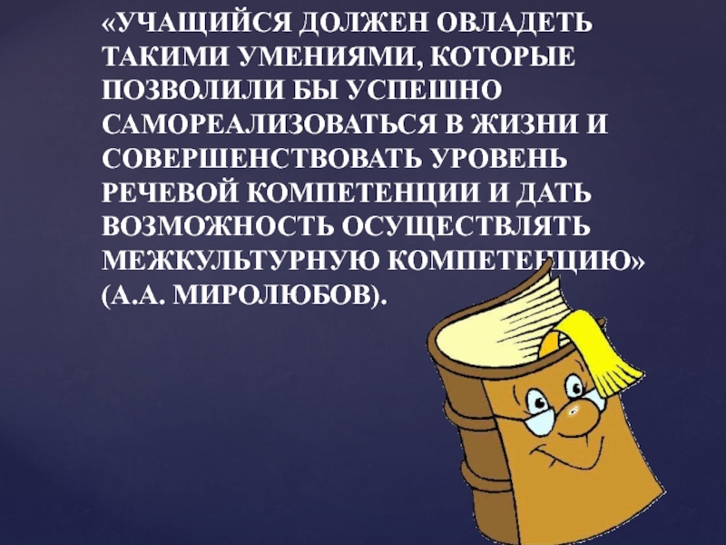 ЖИЗНИ И СОВЕРШЕНСТВОВАТЬ УРОВЕНЬ РЕЧЕВОЙ КОМПЕТЕНЦИИ И ДАТЬ ВОЗМОЖНОСТЬ ОСУЩЕСТВЛЯТЬ МЕЖКУЛЬТУРНУЮ КОМПЕТЕНЦИЮ» (А.А. МИРОЛЮБОВ).