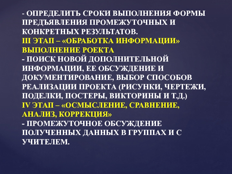 III ЭТАП – «ОБРАБОТКА ИНФОРМАЦИИ» ВЫПОЛНЕНИЕ РОЕКТА - ПОИСК НОВОЙ ДОПОЛНИТЕЛЬНОЙ ИНФОРМАЦИИ, ЕЕ ОБСУЖДЕНИЕ И ДОКУМЕНТИРОВАНИЕ, ВЫБОР СПОСОБОВ РЕАЛИЗАЦИИ ПРОЕКТА (РИСУНКИ, ЧЕРТЕЖИ, ПОДЕЛКИ, ПОСТЕРЫ, ВИКТОРИНЫ И Т.Д.) IV ЭТАП – «ОСМЫСЛЕНИЕ, СРАВНЕНИЕ, АНАЛИЗ, КОРРЕКЦИЯ» - ПРОМЕЖУТОЧНОЕ ОБСУЖДЕНИЕ ПОЛУЧЕННЫХ ДАННЫХ В ГРУППАХ И С УЧИТЕЛЕМ.