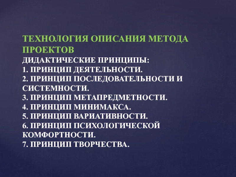 ДИДАКТИЧЕСКИЕ ПРИНЦИПЫ: 1. ПРИНЦИП ДЕЯТЕЛЬНОСТИ. 2. ПРИНЦИП ПОСЛЕДОВАТЕЛЬНОСТИ И СИСТЕМНОСТИ. 3. ПРИНЦИП МЕТАПРЕДМЕТНОСТИ. 4. ПРИНЦИП МИНИМАКСА. 5. ПРИНЦИП ВАРИАТИВНОСТИ. 6. ПРИНЦИП ПСИХОЛОГИЧЕСКОЙ КОМФОРТНОСТИ. 7. ПРИНЦИП ТВОРЧЕСТВА.