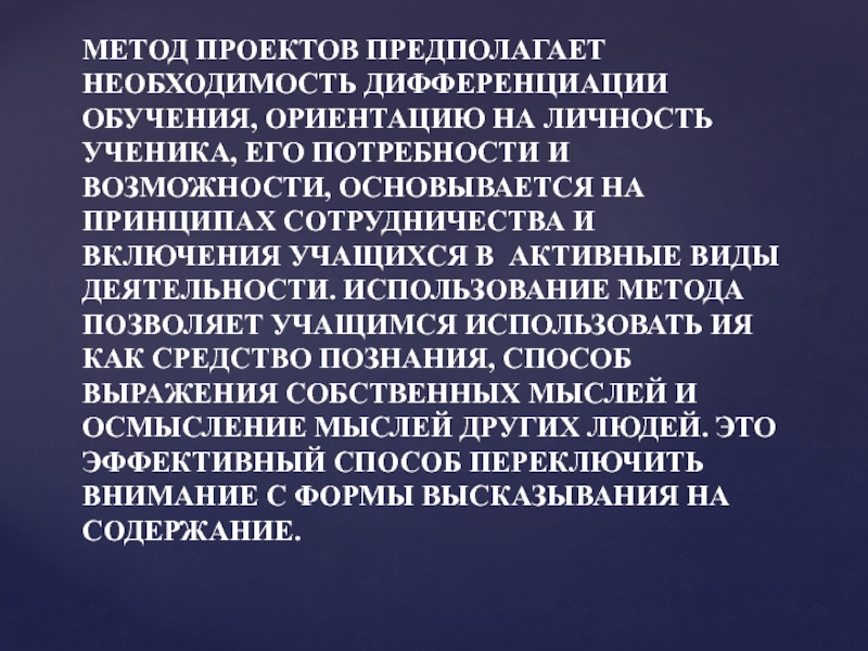 Слайд 10МЕТОД ПРОЕКТОВ ПРЕДПОЛАГАЕТ НЕОБХОДИМОСТЬ ДИФФЕРЕНЦИАЦИИ ОБУЧЕНИЯ, ОРИЕНТАЦИЮ НА ЛИЧНОСТЬ УЧЕНИКА, ЕГО
