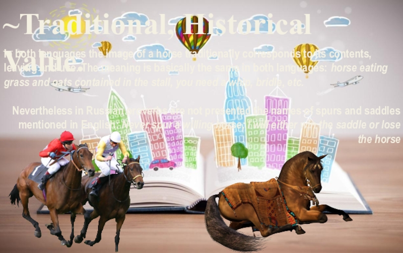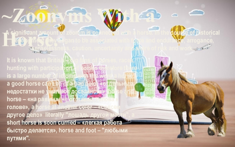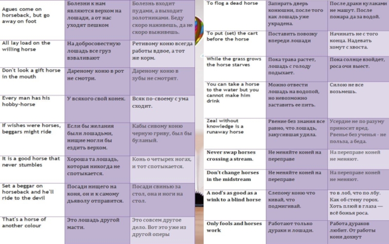 It is known that British – big fans of horses, races, hunting with participation of horses therefore there is a large number of idioms with the word a horse: a good horse can't be of a bad color «отдельные недостатки не умаляют достоинств», horse and horse – «на равных, не отставая, голова к голове», a horse at another color – «совсем другое дело» literally "лошадь другой масти", a short horse is soon curried – «легкая работа быстро делается», horse and foot – "любыми путями".