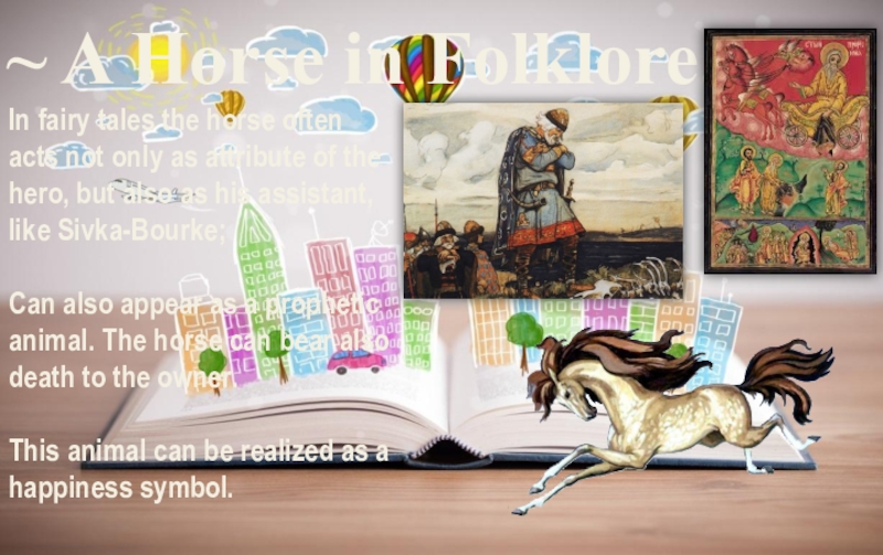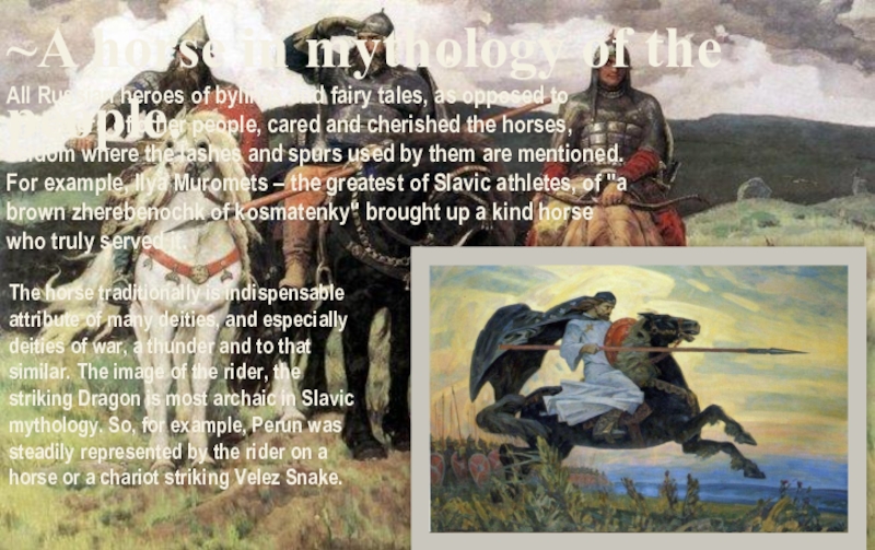The horse traditionally is indispensable attribute of many deities, and especially deities of war, a thunder and to that similar. The image of the rider, the striking Dragon is most archaic in Slavic mythology. So, for example, Perun was steadily represented by the rider on a horse or a chariot striking Velez Snake.